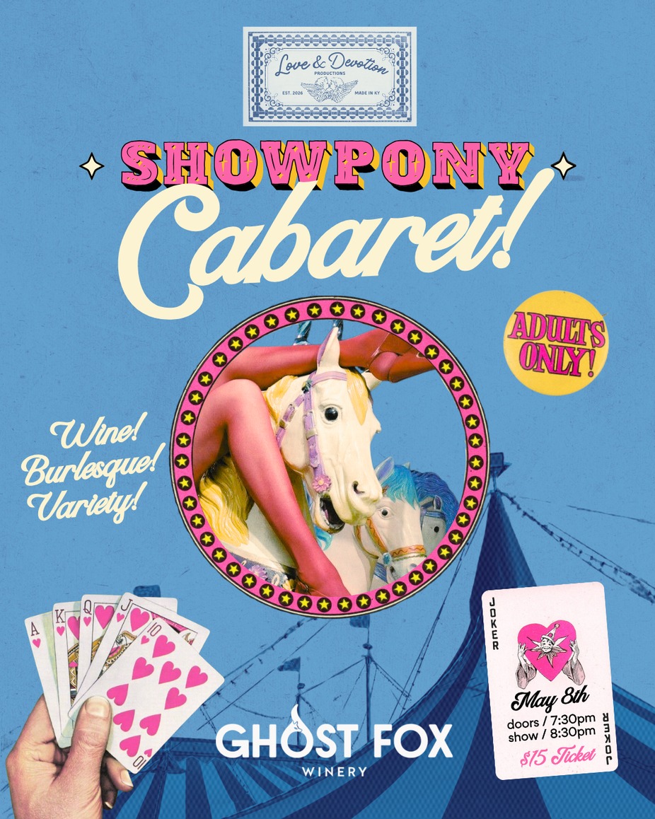 Join us May 8th for the first ever ‘Showpony Cabaret’ at Ghost Fox Winery, a spectacular evening of vaudevillian delight where feathers, fantasy, and fun all meet under one roof! Fill your glass, find your seat, and gather your tipping dollars as Love & Devotion Productions present a show you won’t find under any ol’ big top tent. Expect the unexpected. And expect to find yourself wanting more, more, more!