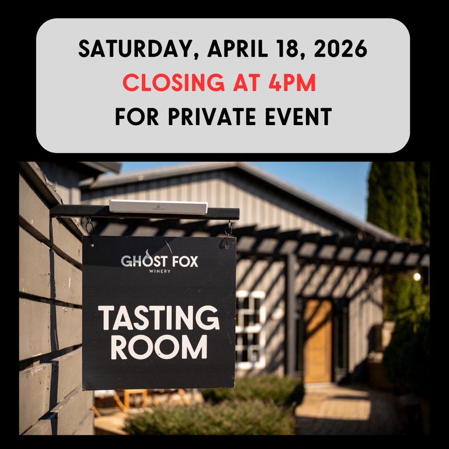 Heads up, wine lovers! April 18th, Ghost Fox Winery will be closing early for a special event. Stop by between 12–4 PM to enjoy your favorite pours before the party starts!